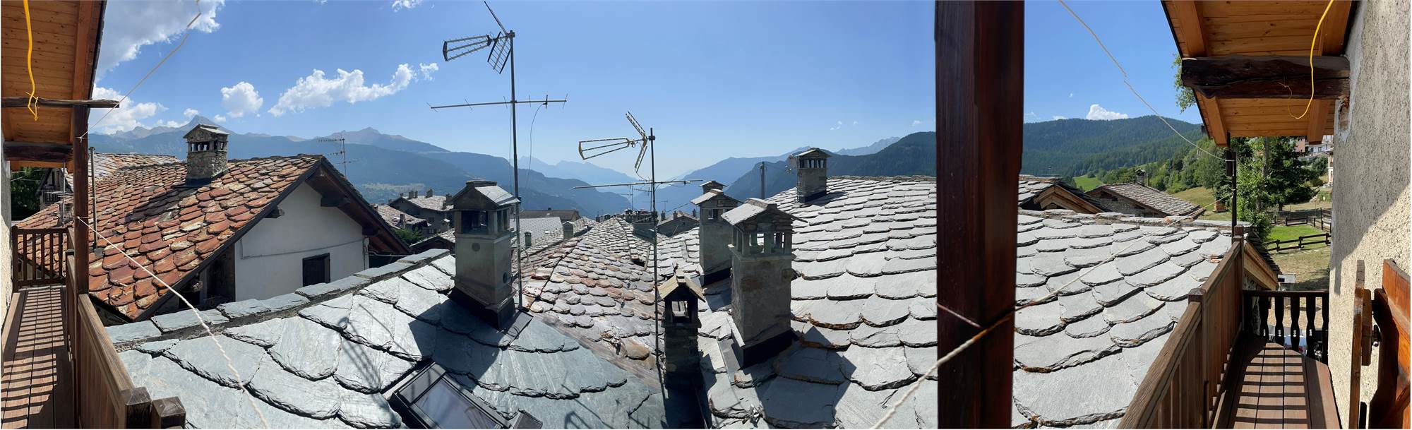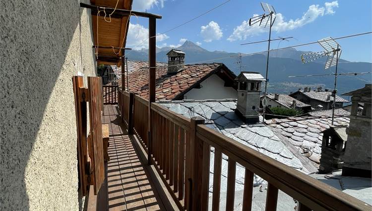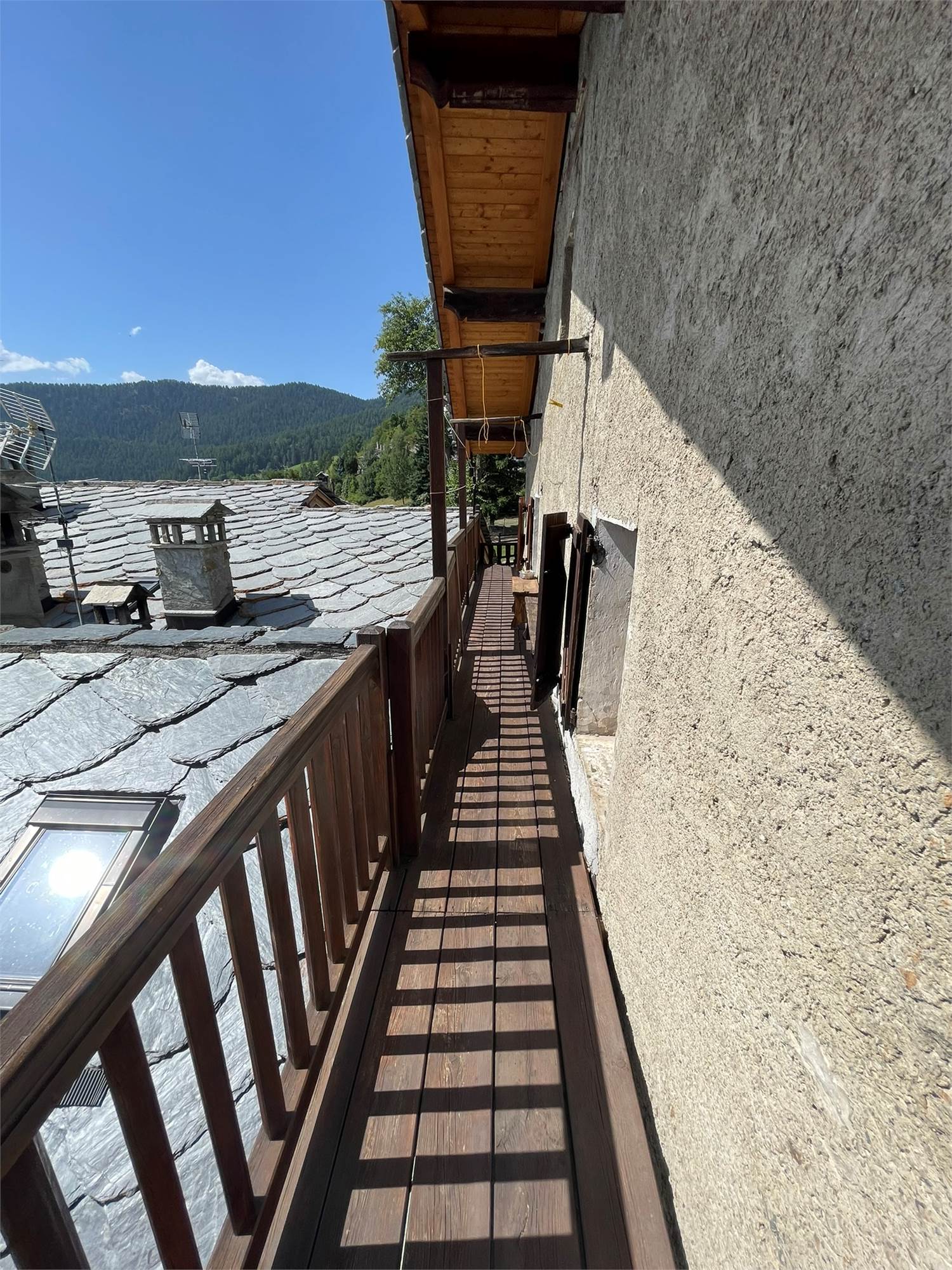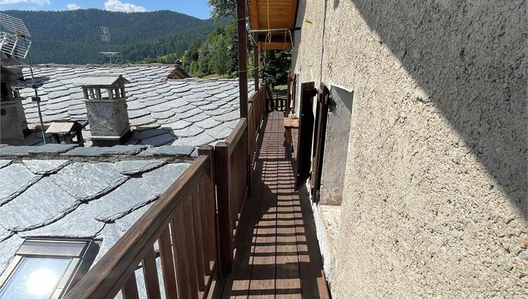 Un ampio balcone in legno corre lungo i lati sud e ovest della casa, regalando splendide vedute sulle montagne e sul paesaggio circostante.